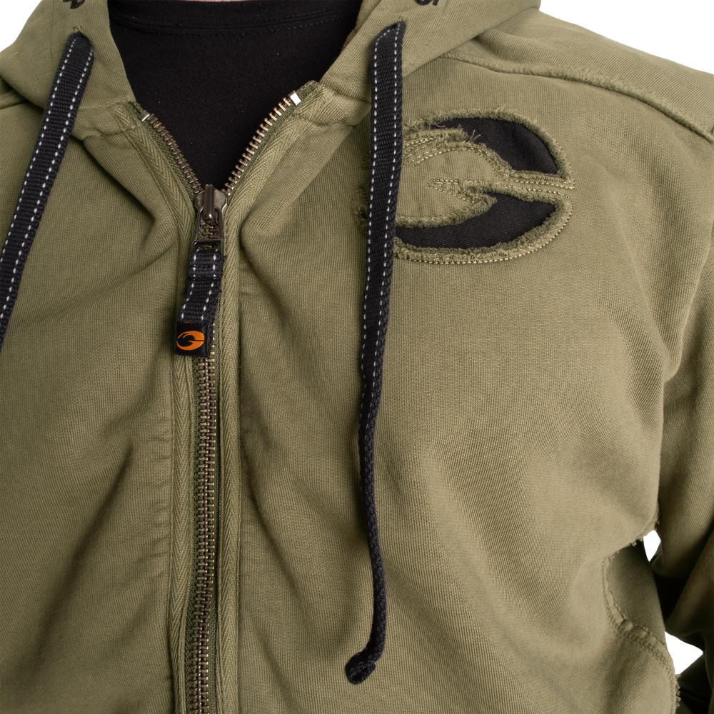 Features: Branded tab on zipper, logo application on chest and sleeve, embroidery around hood, robust drawstrings, heavy cotton/lycra rib material in sides