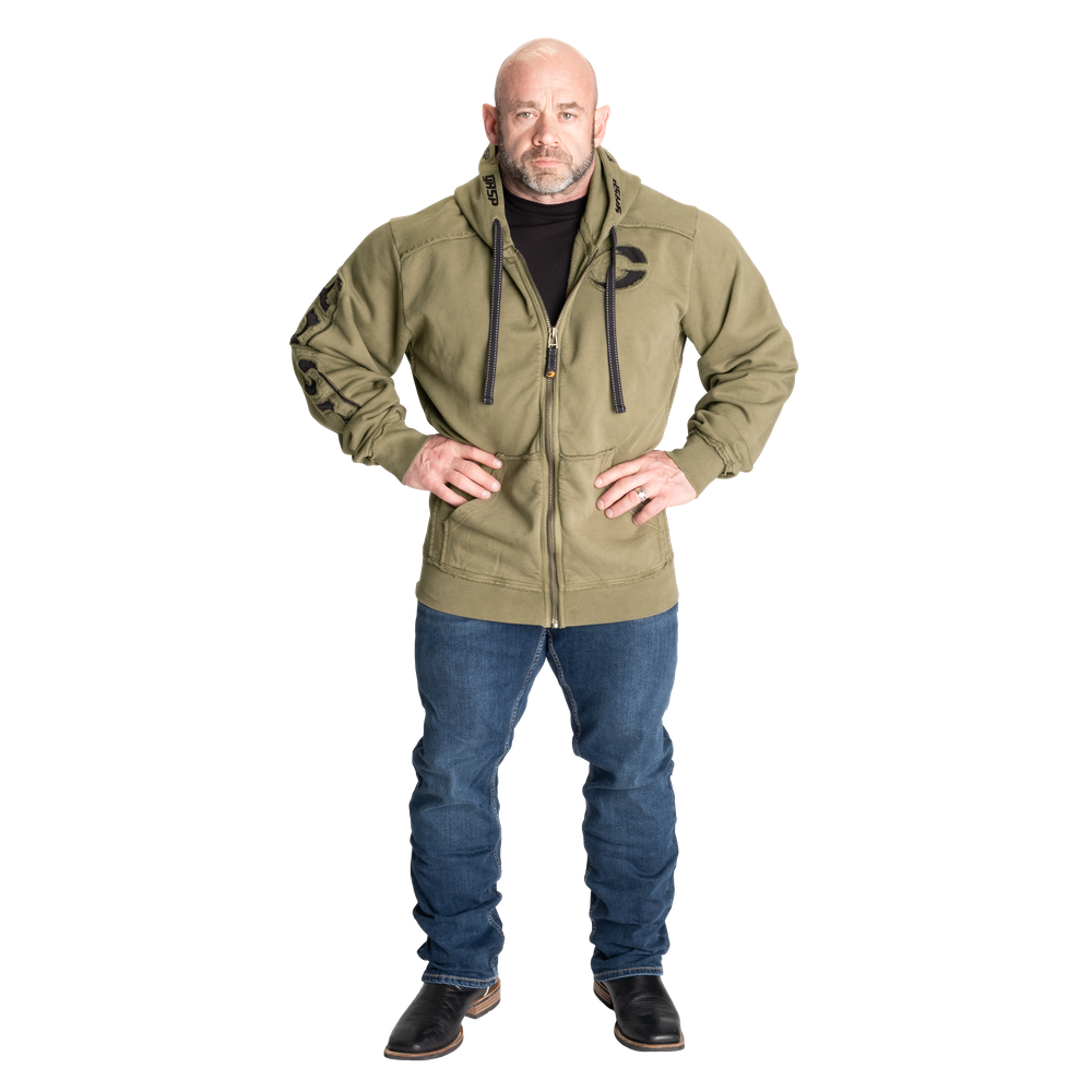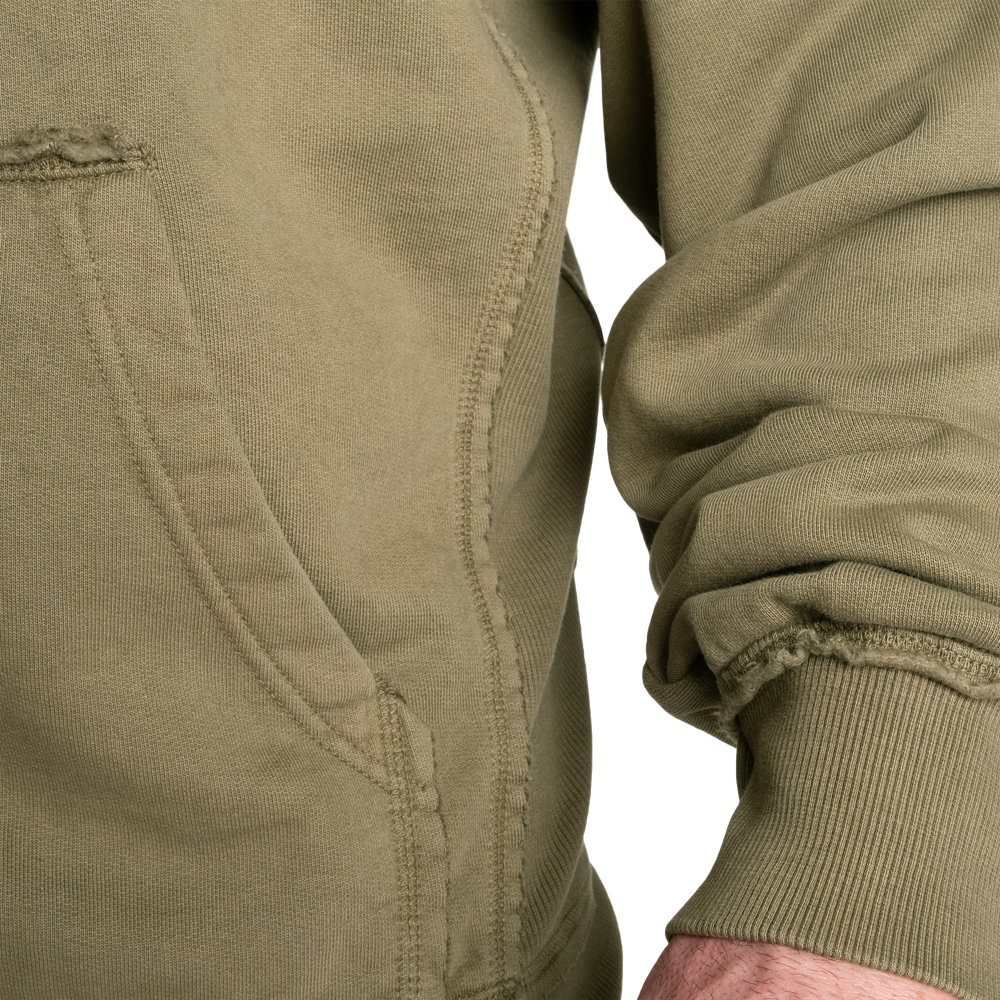 The hoodie has a washed look with robust details. It is made in 100% heavy cotton with a stretchy cotton/lycra rib in the sides for comfort.