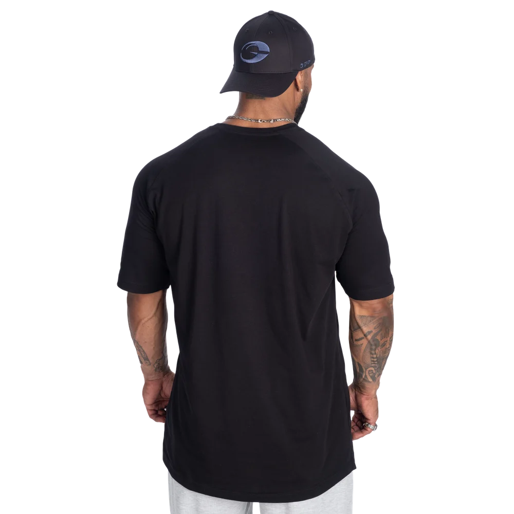 Made from a premium BCI cotton and elastane blend, the fabric delivers natural stretch and a smooth, structured feel straight off the rack. The tee maintains a clean, crisp expression that holds its shape over time. The raglan sleeves enhance mobility and shoulder definition, while the scooped bottom hem adds a timeless athletic silhouette.