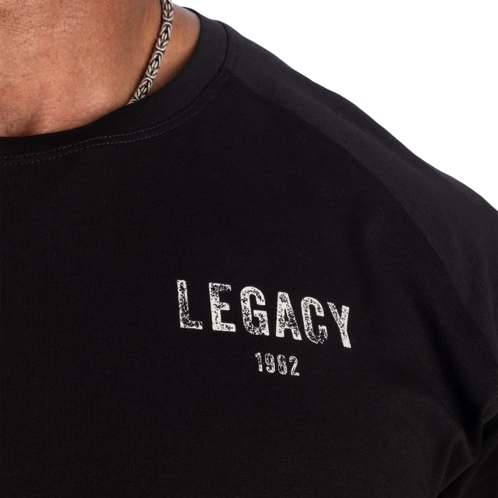 Features: Raglan sleeves, scooped bottom hem, soft stretch fabric, small logo tab at left sleeve, Legacy 1982 chest print