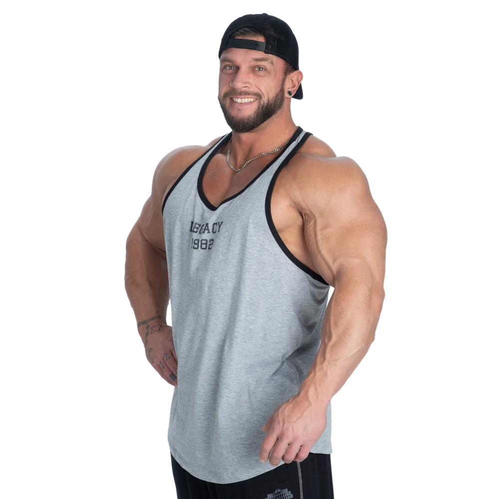The soft poly/cotton blend offers breathability and comfort, while the open T-back design allows full range of motion. Contrast piping sharpens the look, and the centered Legacy print anchors the piece in Better Bodies heritage.