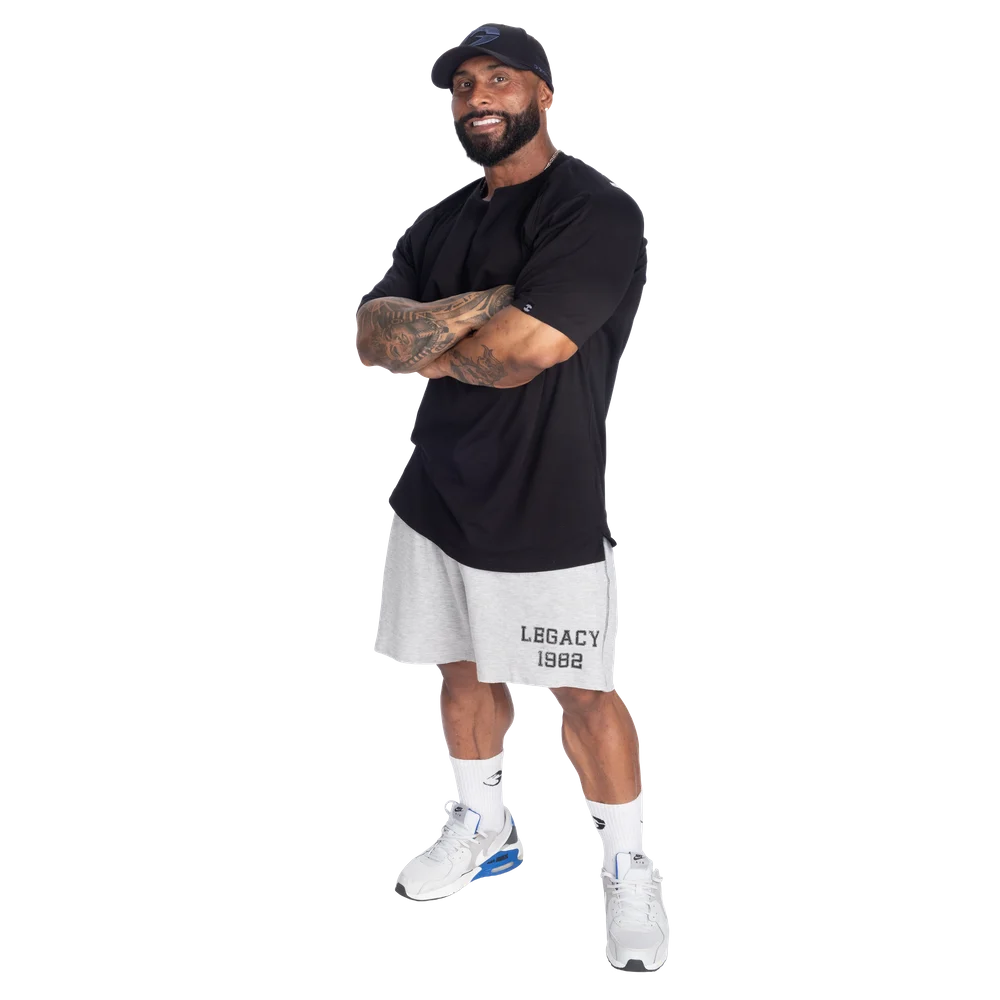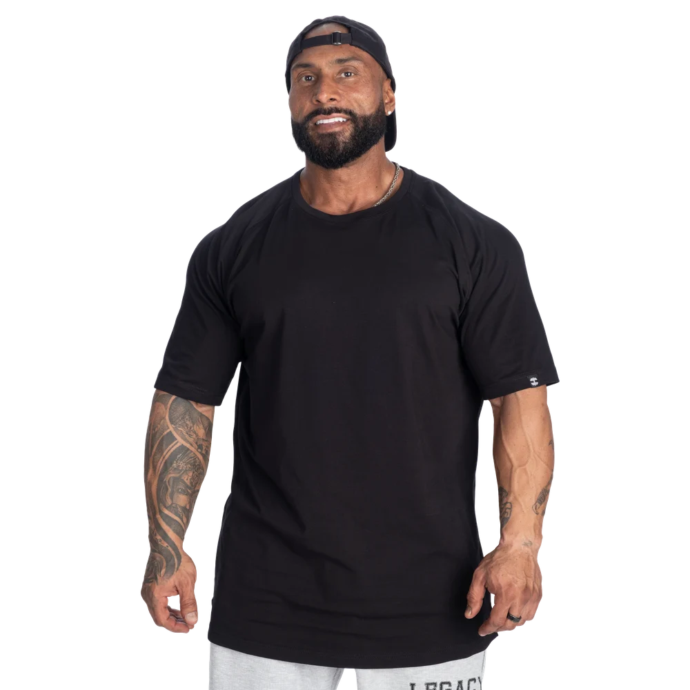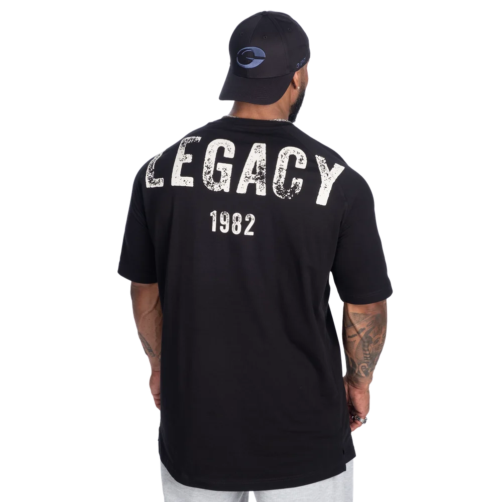 Features: Raglan sleeves, scooped bottom hem, soft stretch fabric, woven logo tab at sleeve, large LEGACY 1982 back print