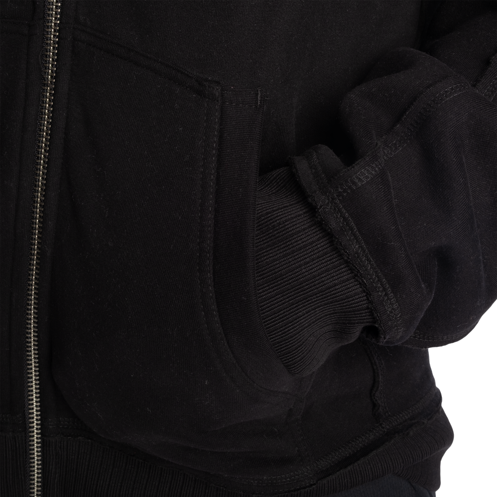 Features: Garment washed for comfort, lined hood, 3D embroidery on the hood, bold sleeve print, kangaroo pockets, durable zipper