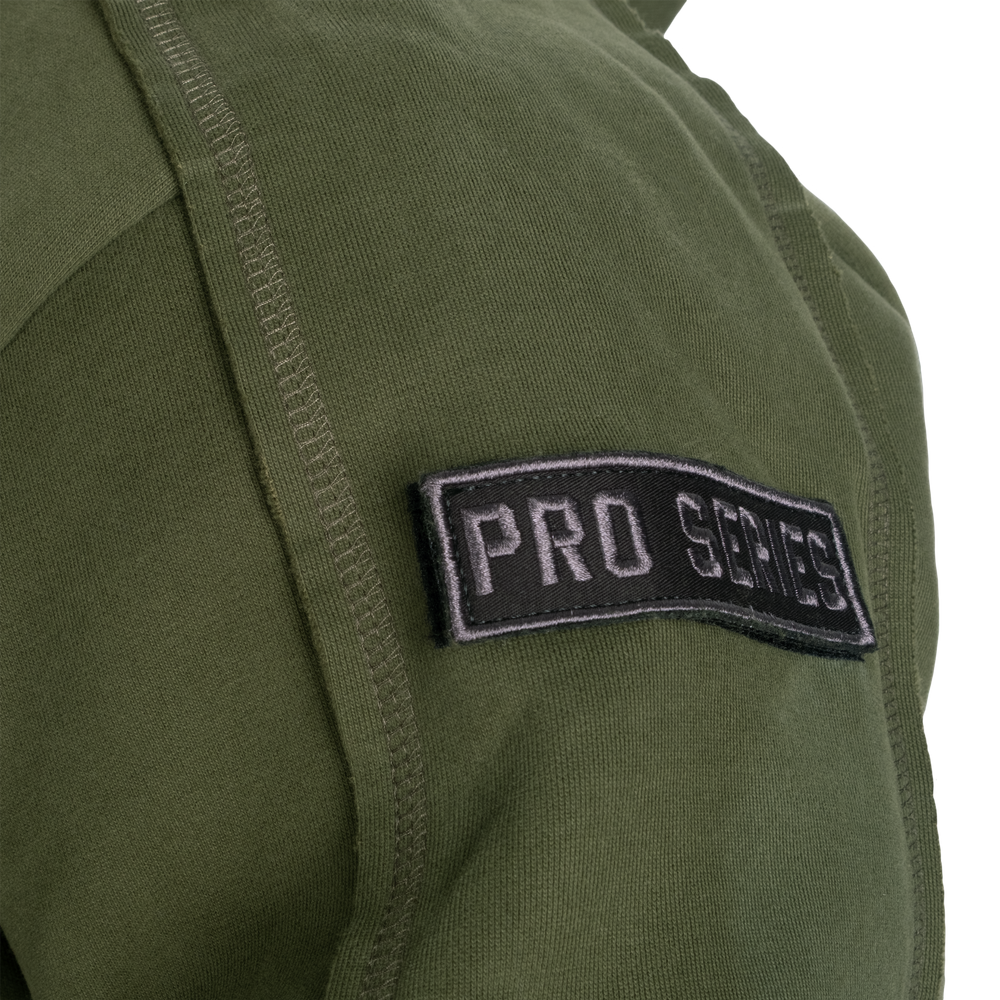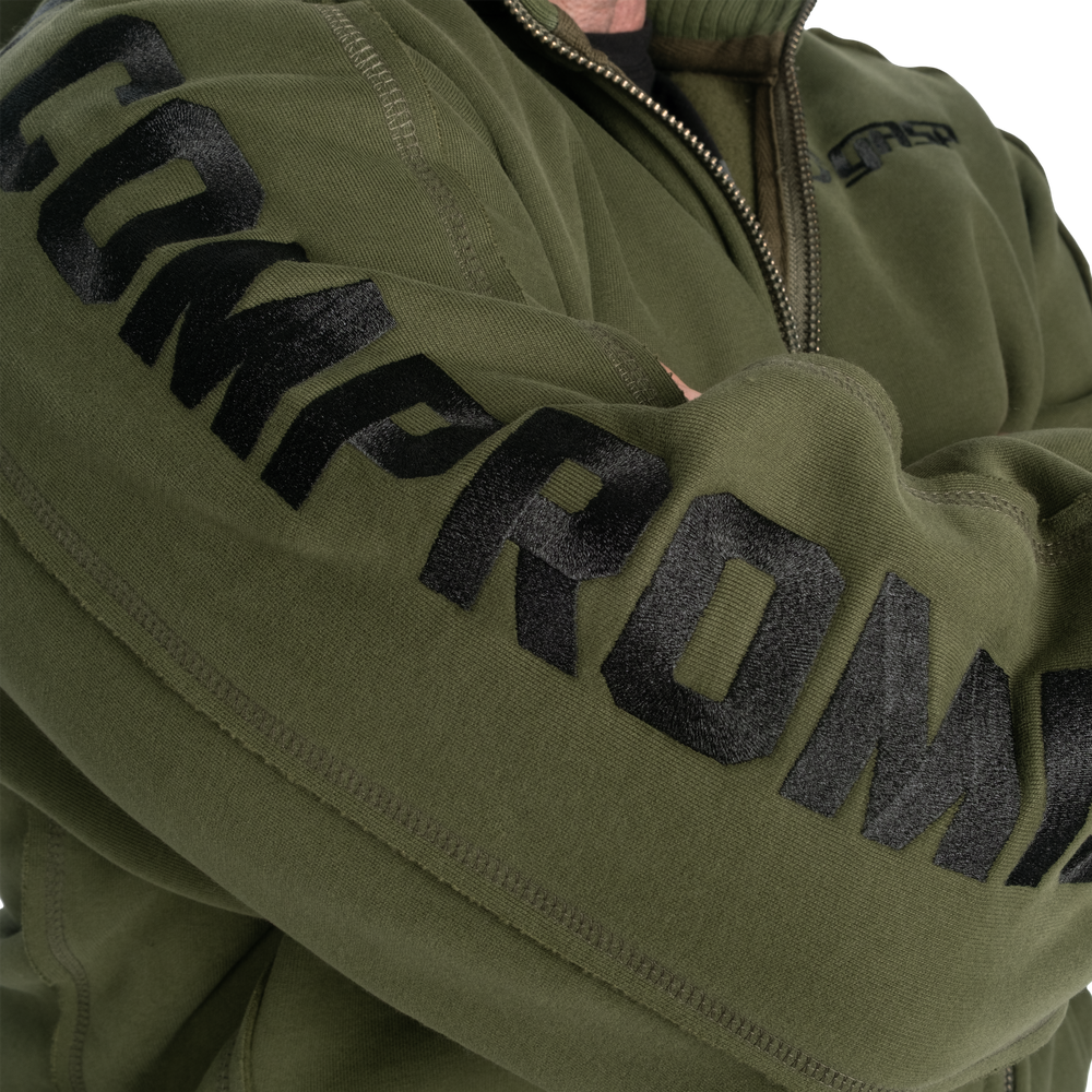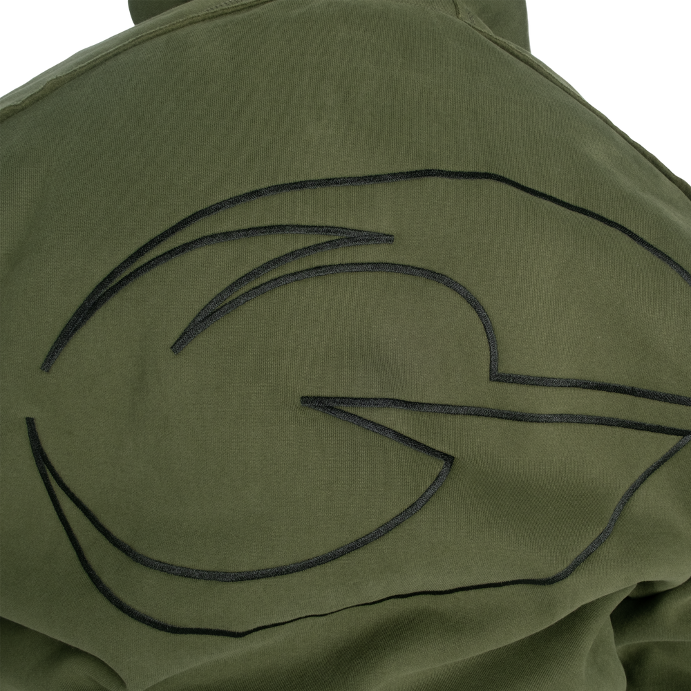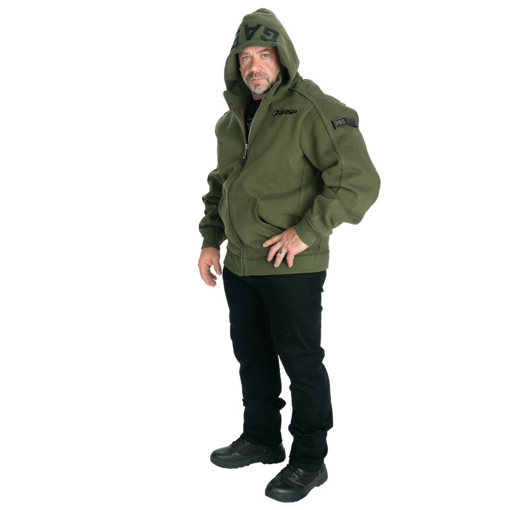 Features: Rib at collar and cuff, embroidery application at hood, chest and sleeve, hand pockets, metal zipper, soft brushed fabric, hook & loop patch space on left sleeve.