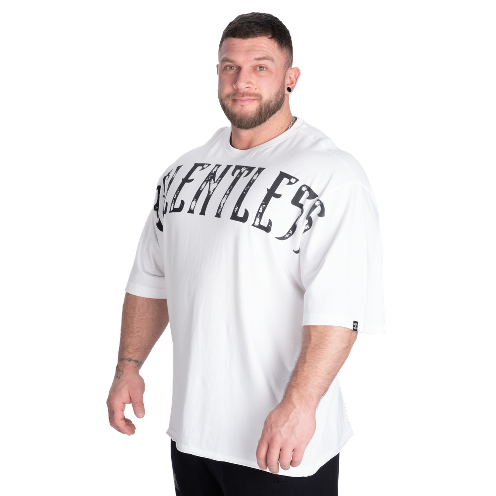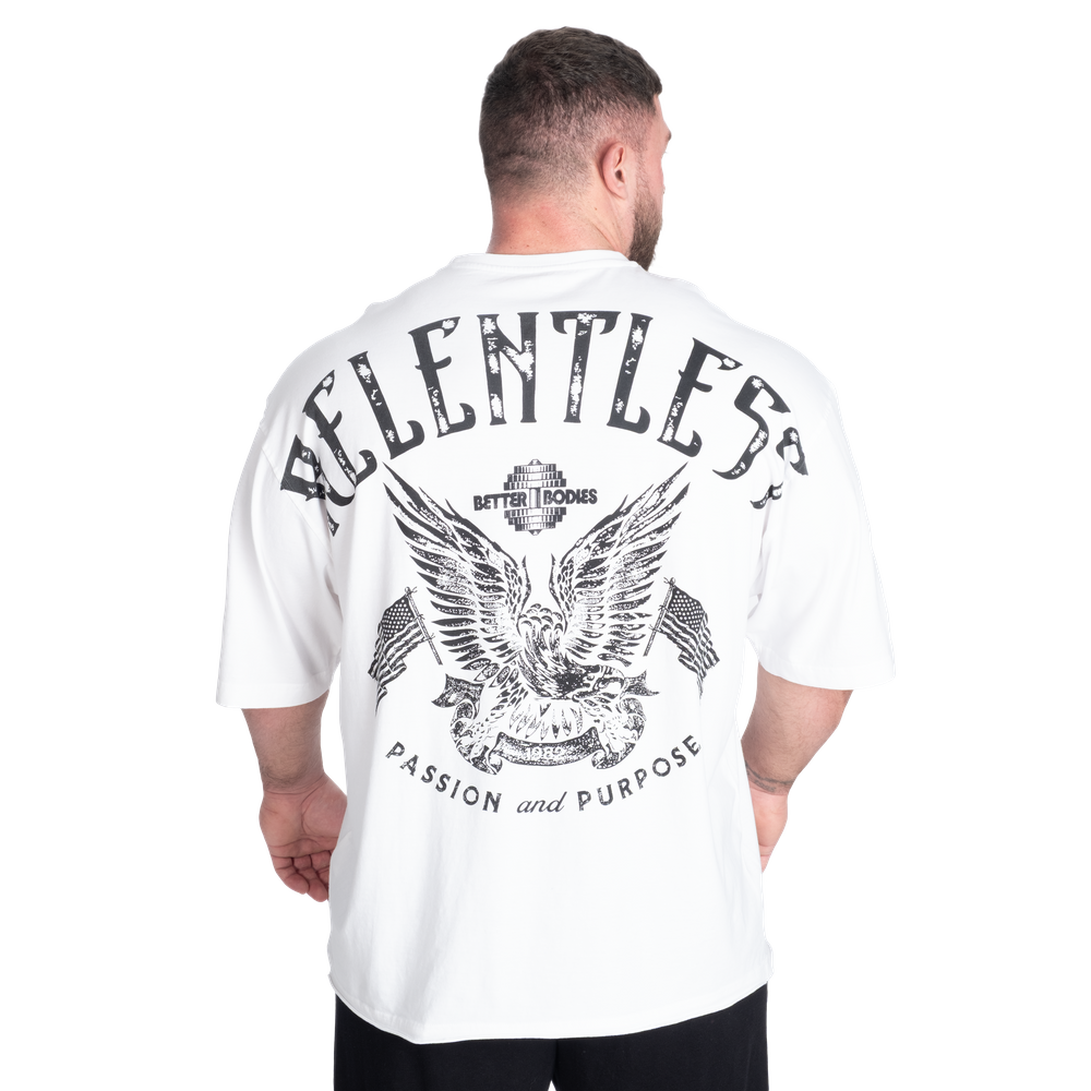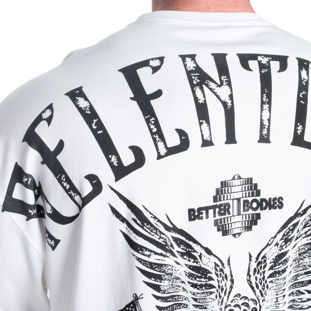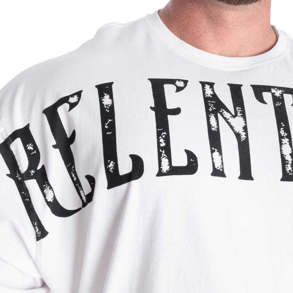 It is made in a soft 100% Cotton fabric that has been washed for a vintage look and feel. There's a small print on the chest and a while the back boasts a large Relentless print as a reminder to be relentless on your fitness journey and in life.